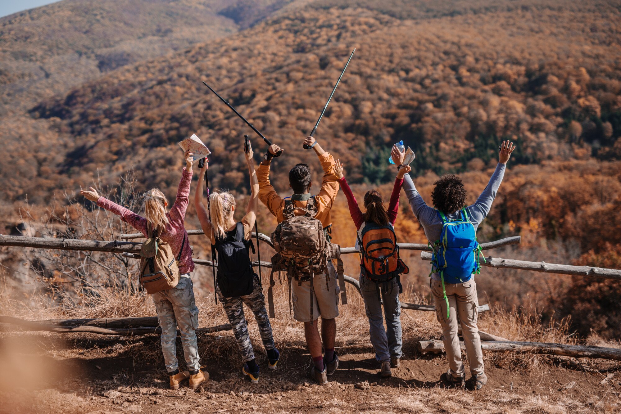 Millennial African American man leading friends hiking single file uphill on a path in countryside