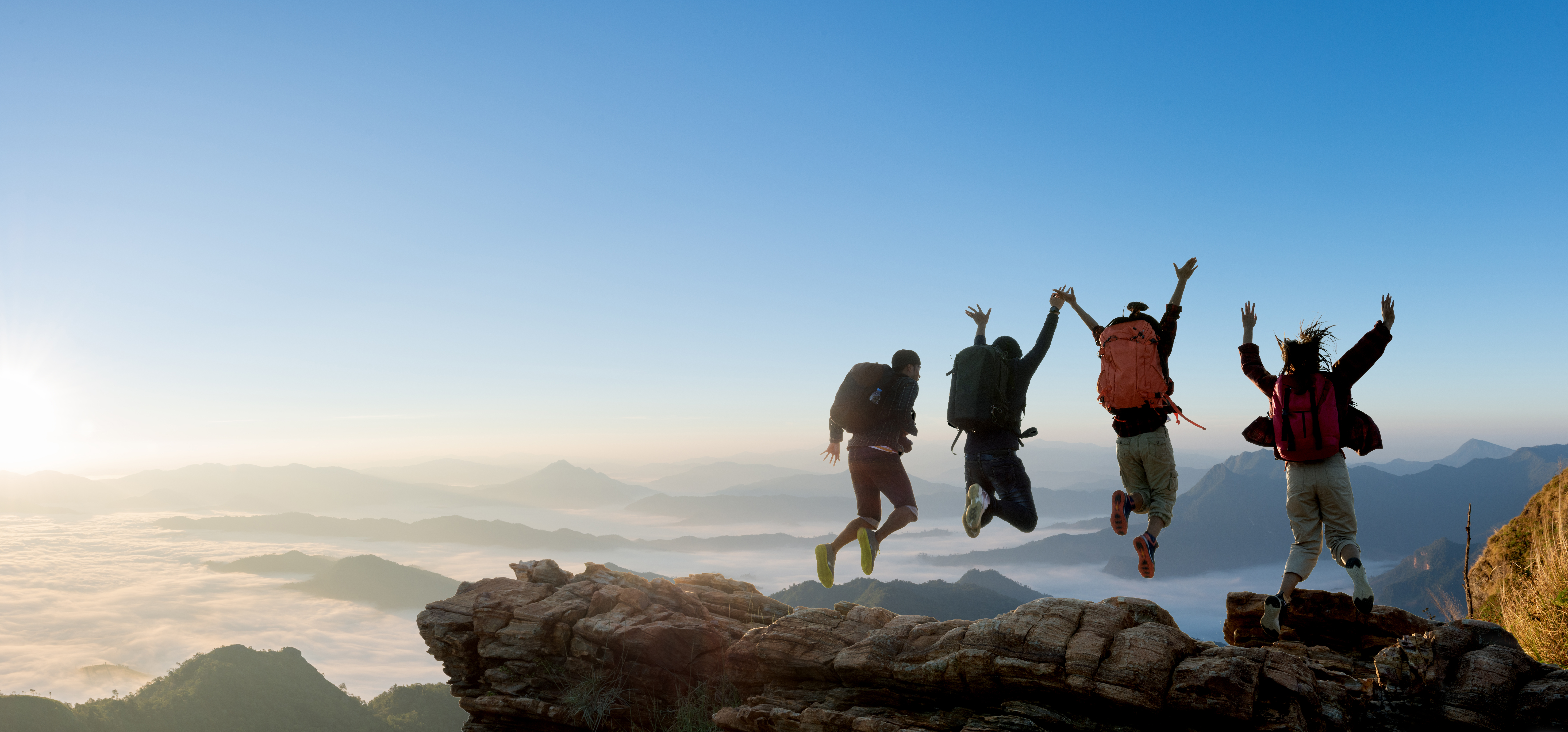 Group of happy hiker jumping on the hill
