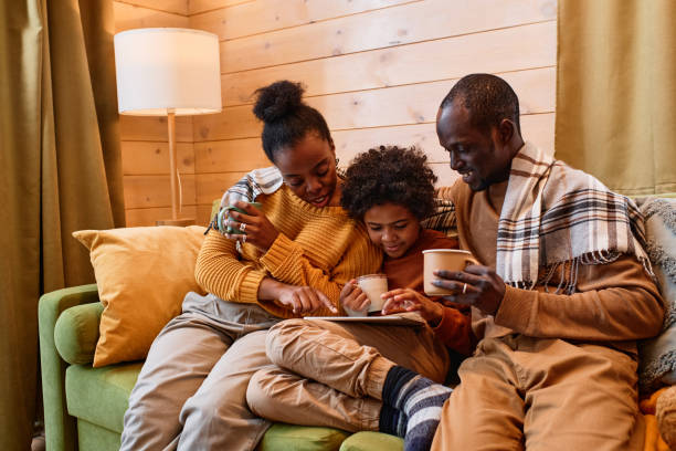 Affectionate family with hot drinks discussing something in digital tablet while relaxing on comfortable couch in their country house