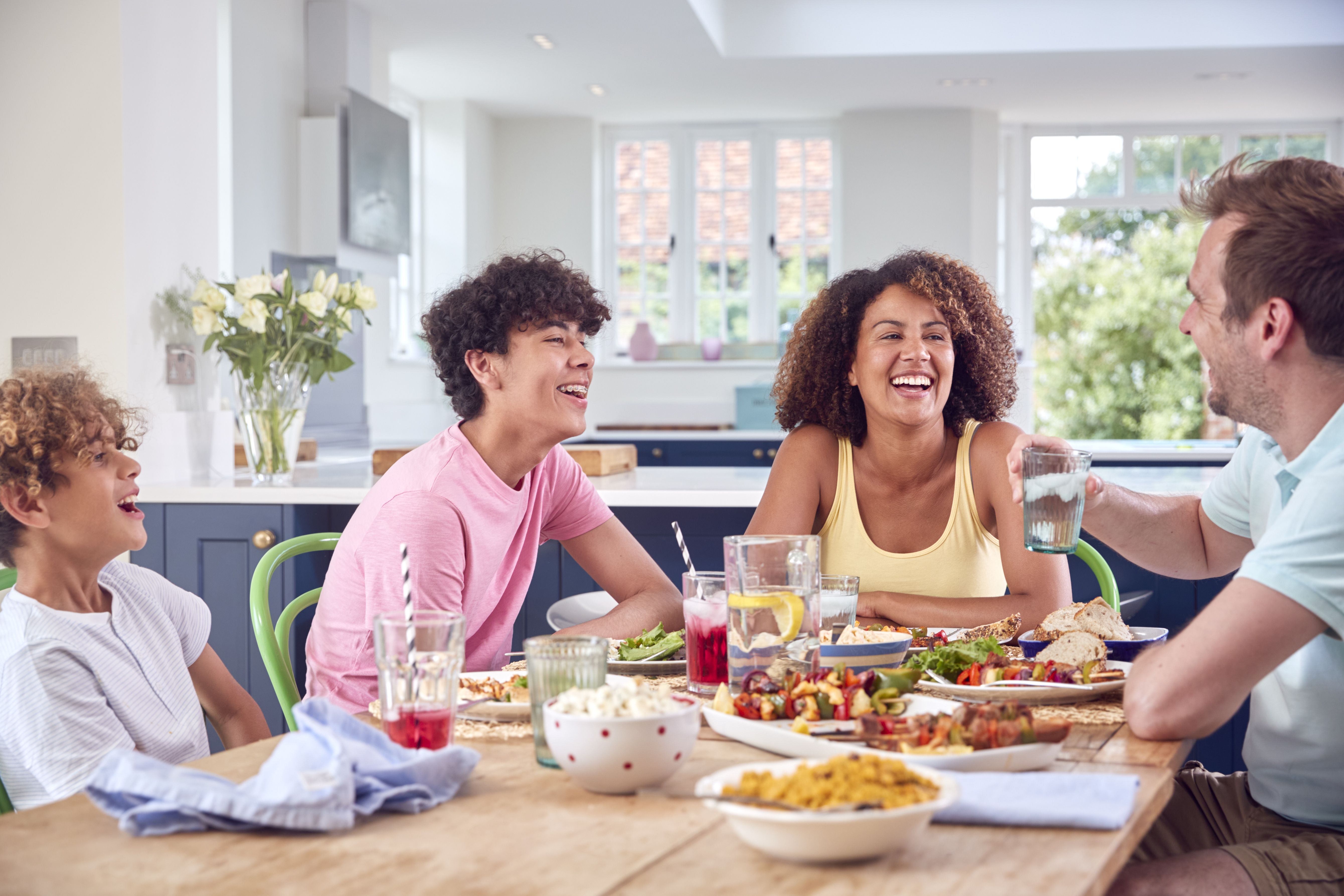 Family Sitting Around Table At Home Eating Meal Together