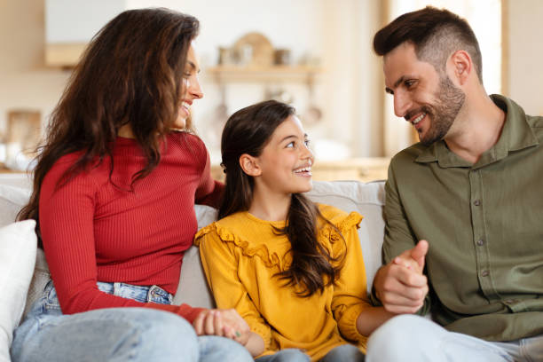 Family talking sitting on couch at home, planning new adventures.