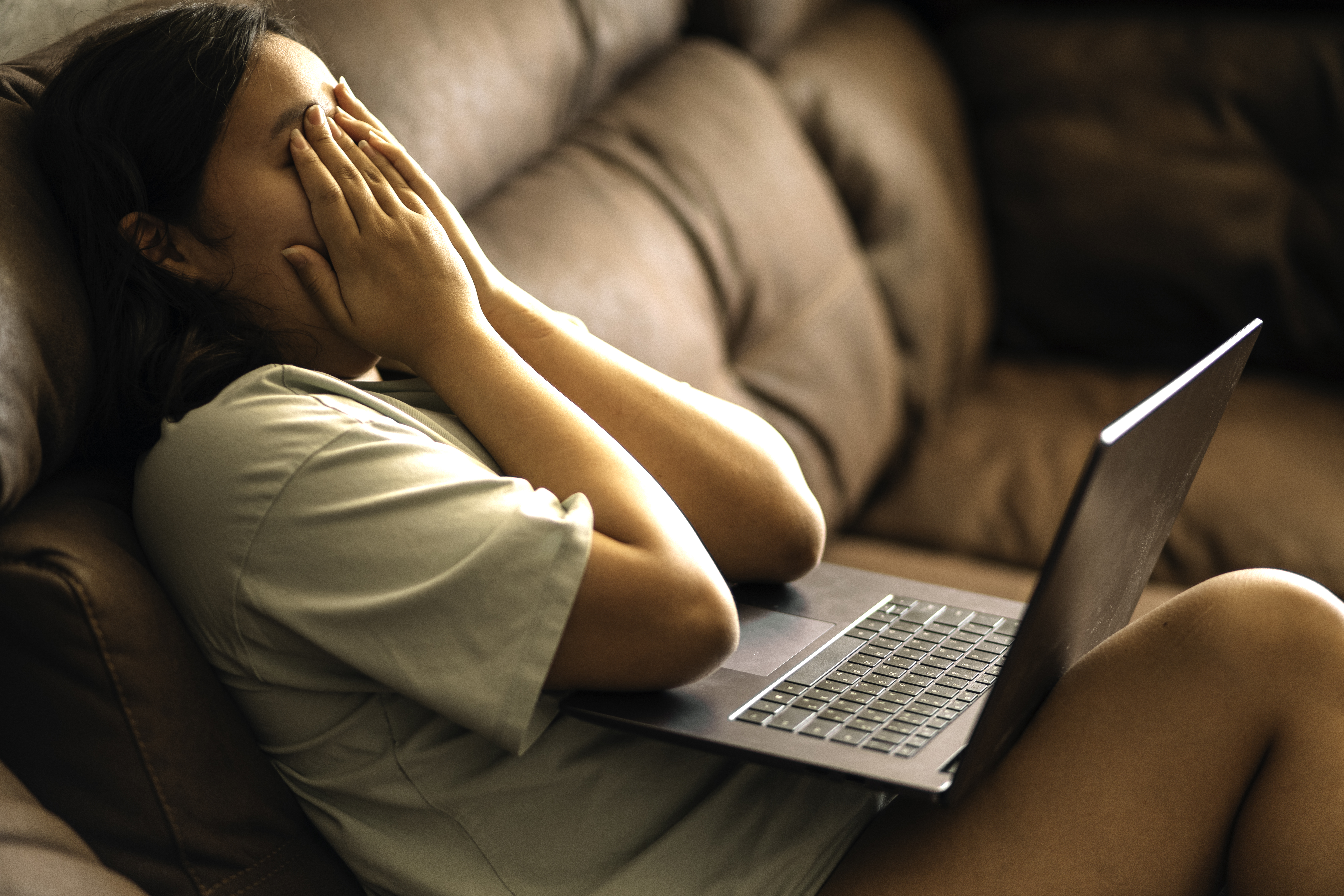Chubby asian teen girl at home, sitting on the sofa with a laptop on her lap. sad news