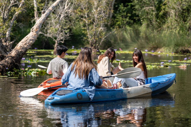 Group of Asian young man and woman play rowing kayak in a forest lake. Backpacker traveler friends travel and kayak on canoe in beautiful mangrove forest enjoy spend time on holiday vacation together.