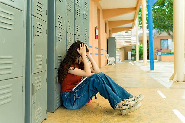 Stressed high school student sitting on the floor by the lockers holding her head with her hands
