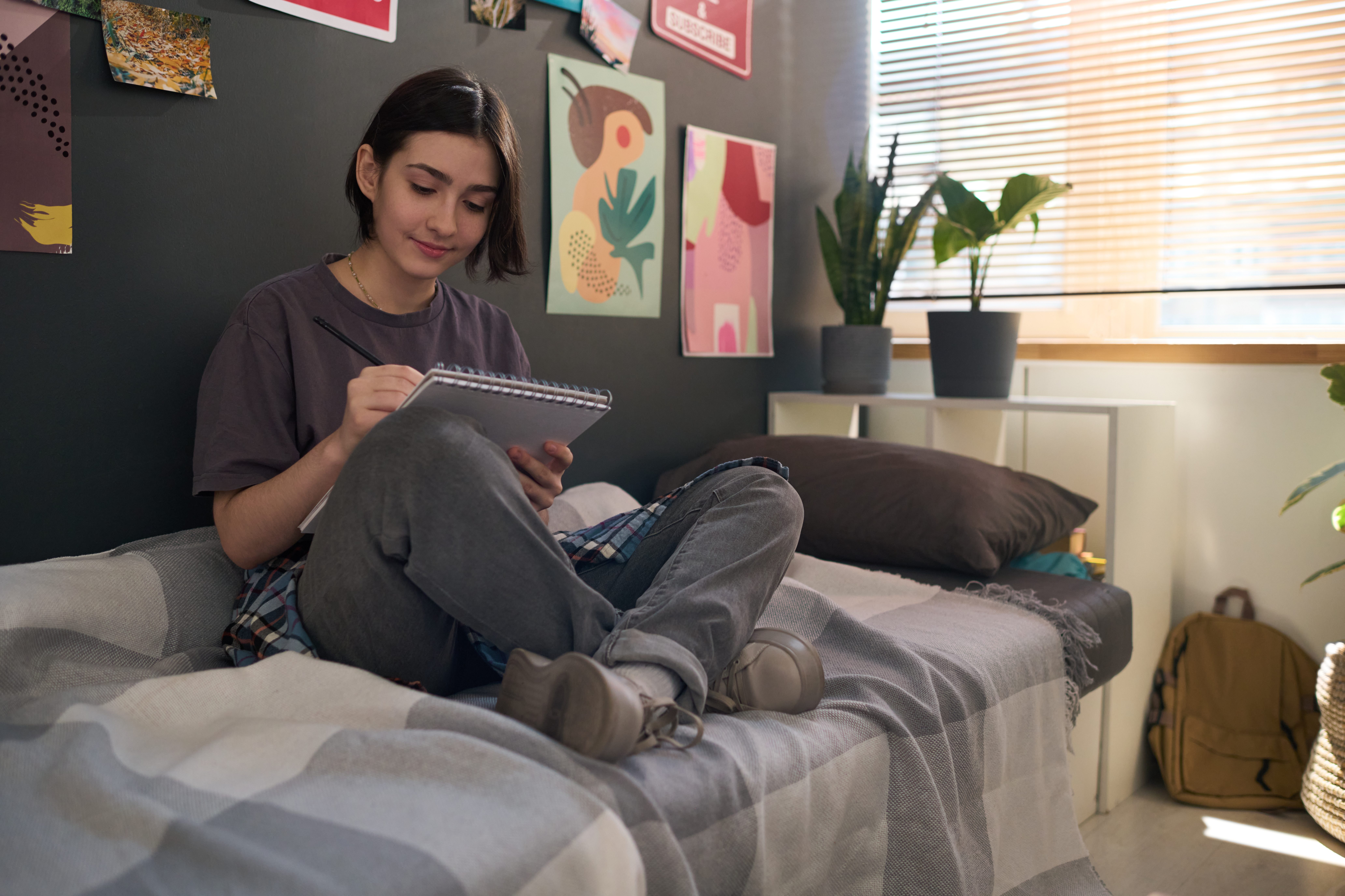 Full length portrait of teenage girl sitting cross-legged on bed and drawing in sketchbook in dorm room with wall art copy space