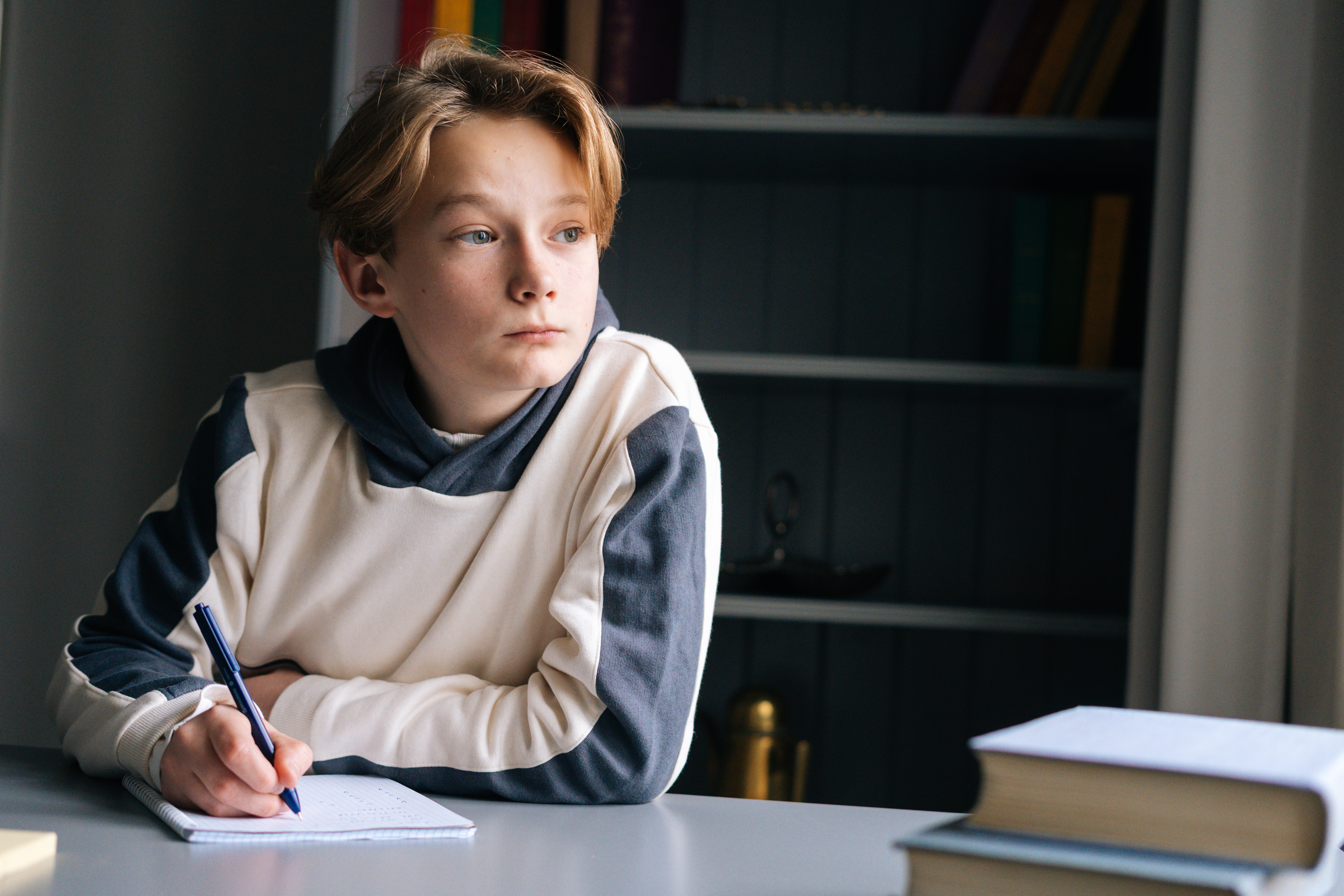 Close-up of thinking pupil boy thoughtful writing in notebook with pen sitting at desk near window. Shotting from below of child schoolboy doing homework at home.