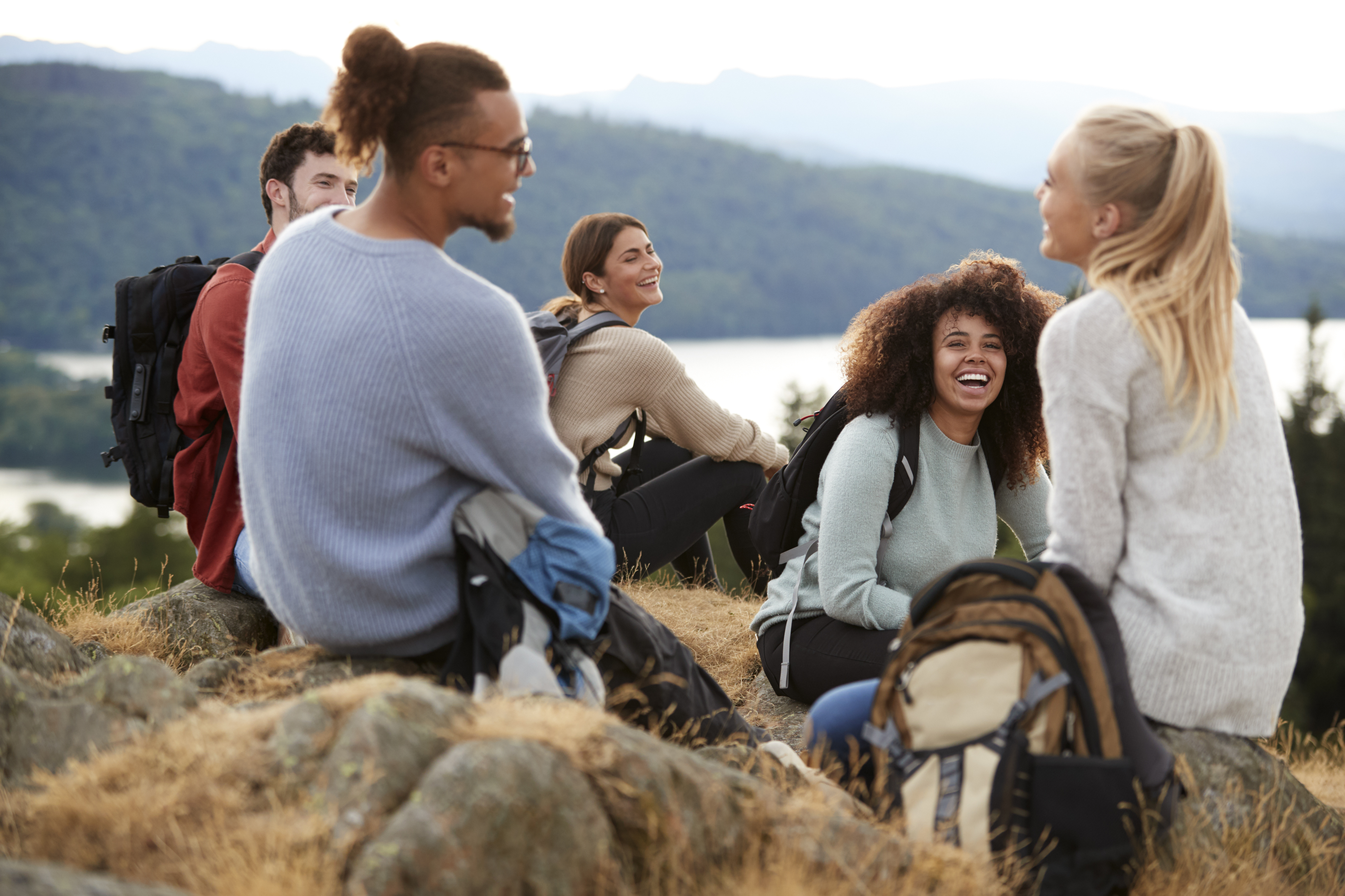 Five diverse young people on group therapy session
