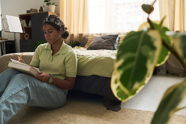 Teenage girl focusing on writing in notebook while sitting cross-legged on floor in cozy living room with sunlight