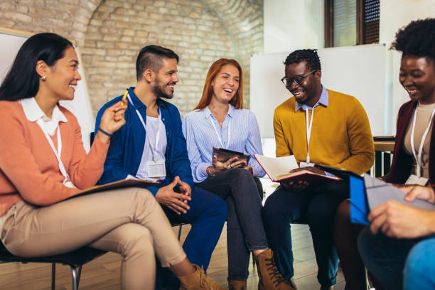 Five diverse young people on group therapy session