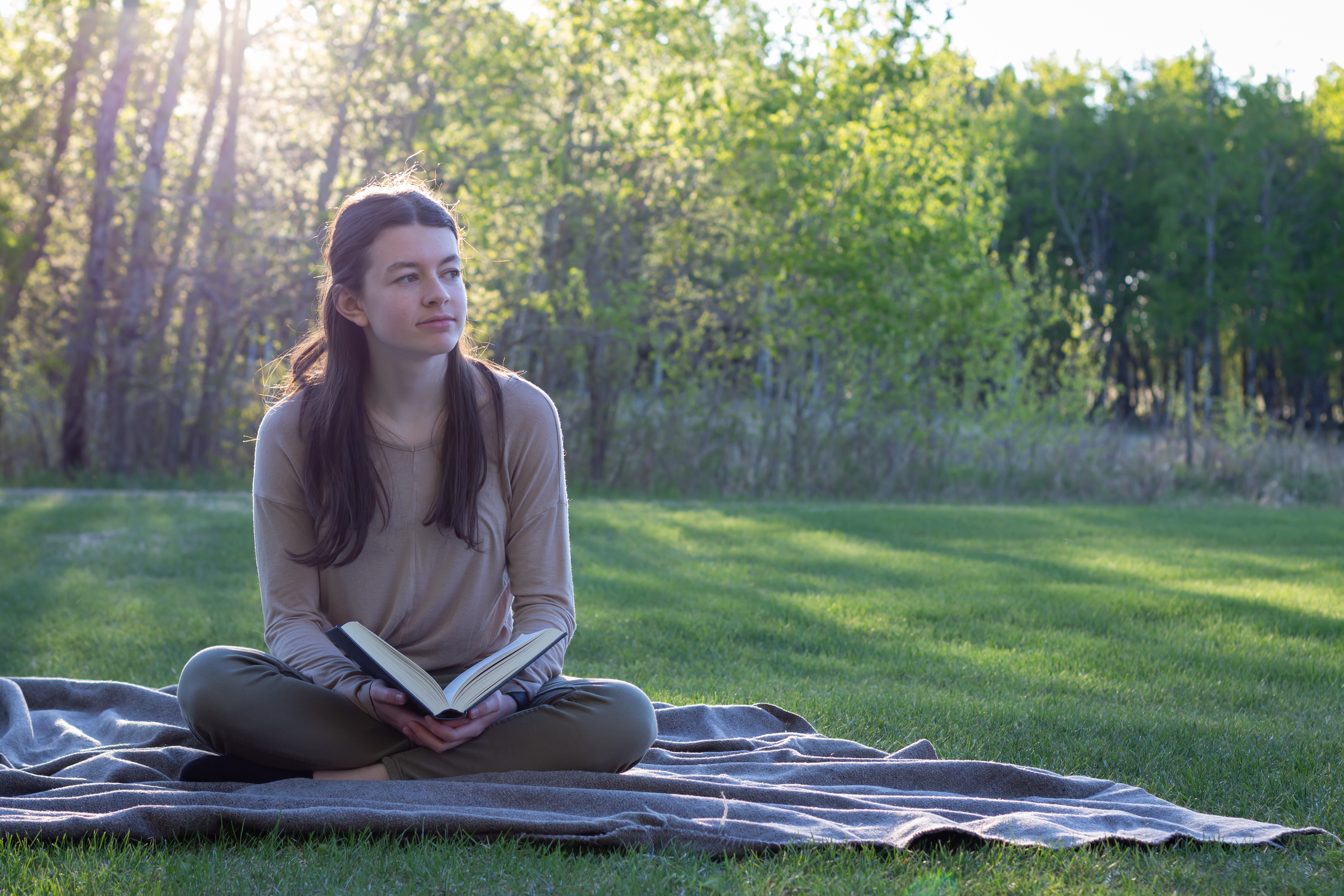 young woman reading a book in the sun in the evening white sitting on a blanket on the grass and looking off to the side, trees behind her with copy space